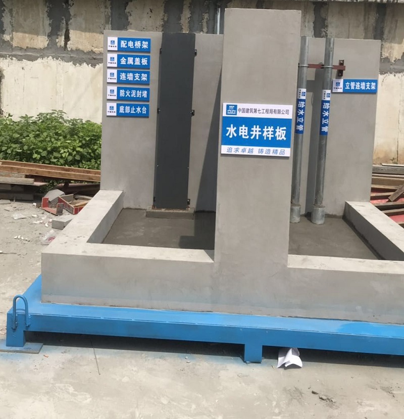 材質及做法:水井安裝地漏,給排水、消防立管,防水套管及支架安裝等工藝;電井展示橋架安裝,跨接地線,橋架穿樓板預留洞,防火封堵等工藝。
